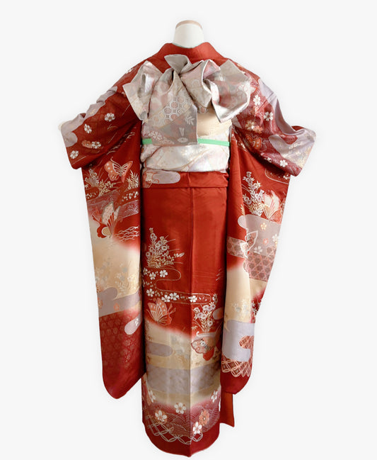 成人式振袖・赤丹 赤系 暈し染め 駒刺繍 金彩 蝶 花草 ヱ霞 ZX301-C