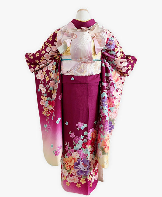 成人式振袖・中紅 赤紫系 暈し染め 牡丹 桜 百花繚亂 ZX302-C