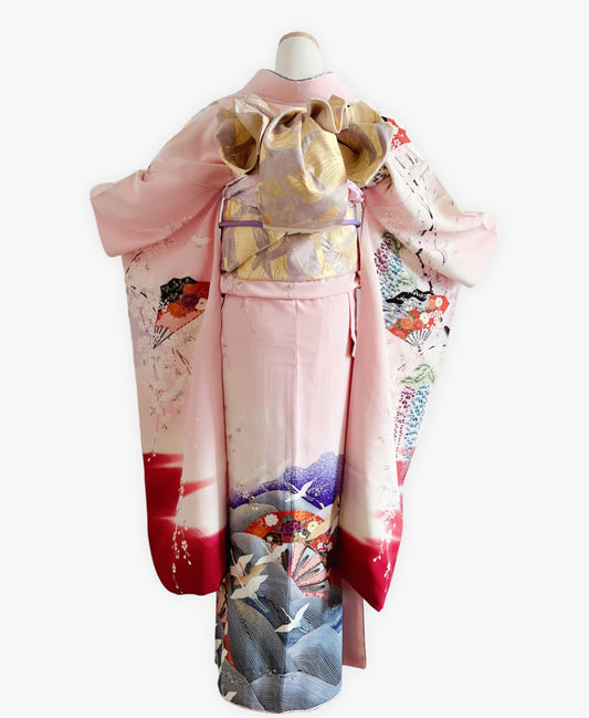 成人式振袖・撫子色 ピンク系 暈し染め 駒刺繍 金彩 藤 桜 扇 鶴 風景 ZX310-C