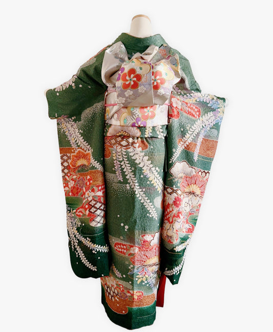 木賊色 緑系 暈し染め 絞り 藤 松 花草 振袖レンタル ZX606