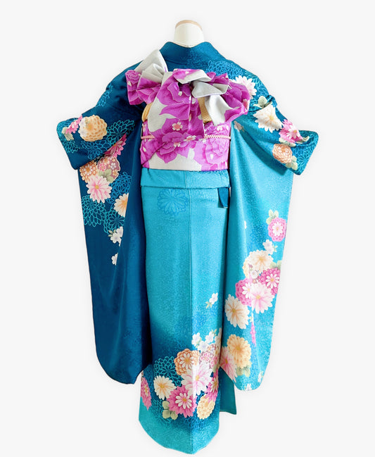 縹色 青系 暈し染め 金彩 手描き 菊 桜 雪輪 振袖レンタル ZX609