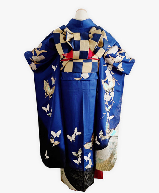 納戸色 青系 暈し染め 蝶 花草 振袖レンタル ZX607