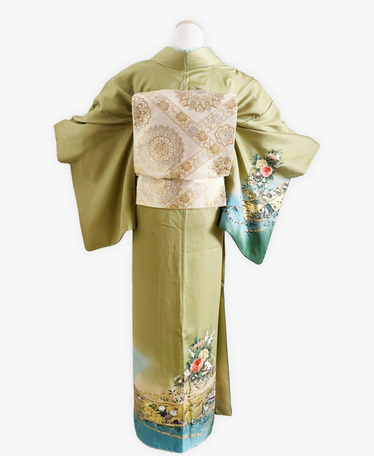 若葉色 緑系 暈し染め 駒刺繍 金彩 牡丹 花瓶 熨斗 訪問着レンタル FW606