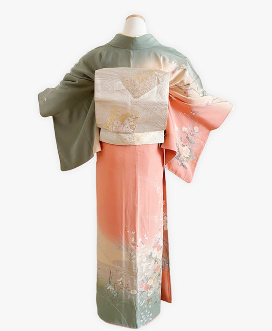 深川鼠 緑系 暈し染め 金彩 牡丹 花草 鷺 風景 訪問着レンタル FW608