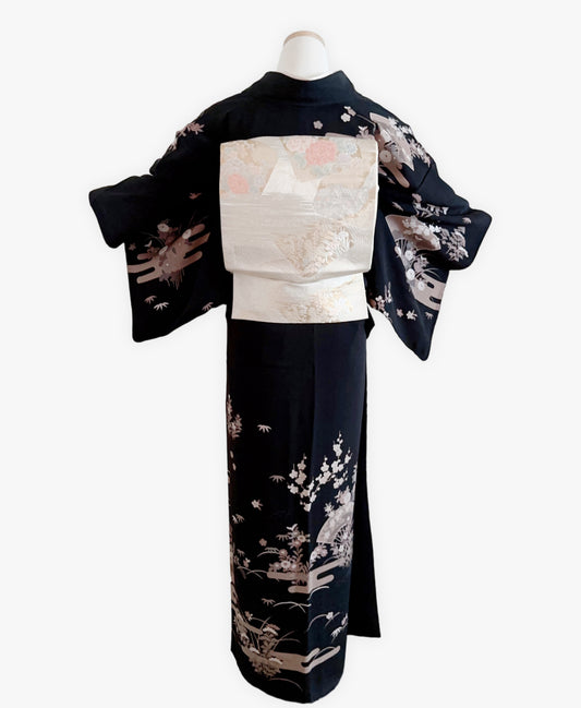 濡羽色 黒系 型染め 扇面 花草 絵が炭 ヱ霞 訪問着レンタル FW750